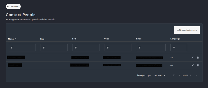 next to an entry on the Contact People page. This brings up the Edit Person page where you can add, remove or edit phone number details and email addresses associated with the contact. - A contact entry can be removed either by clicking on the trash icon next to the contact entry on the Contact People page, or by clicking the Remove button within the Edit Person page.